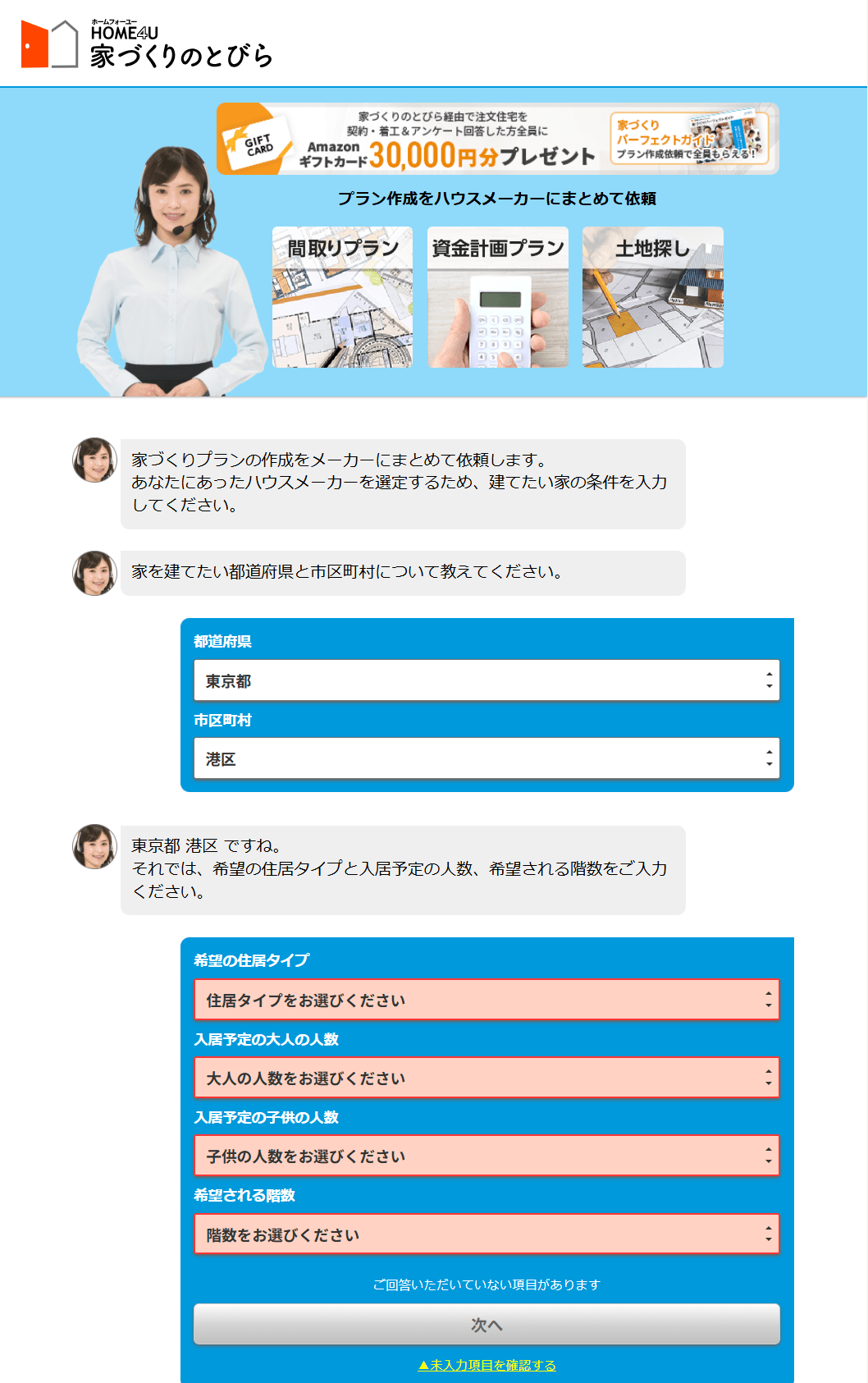 書いてあるとおりに、お姉さんのチャットボットの質問にただ答えていくだけで、家づくりパーフェクトガイドがもらえます!